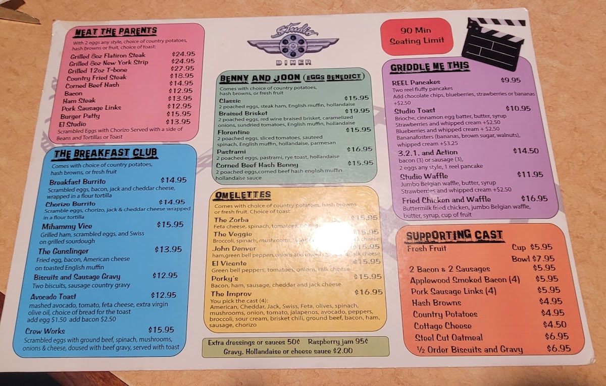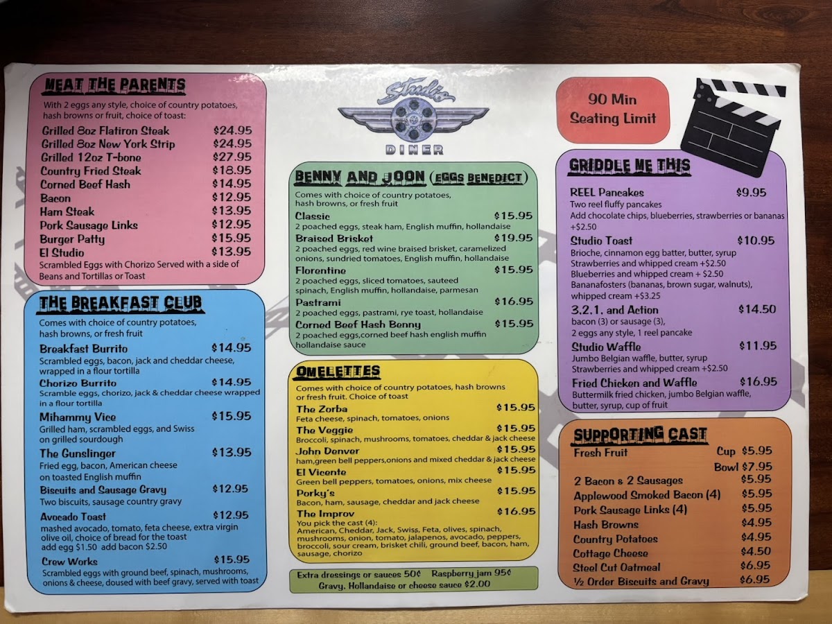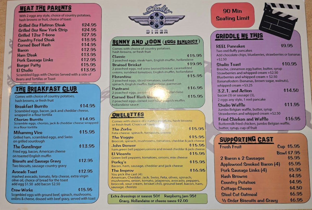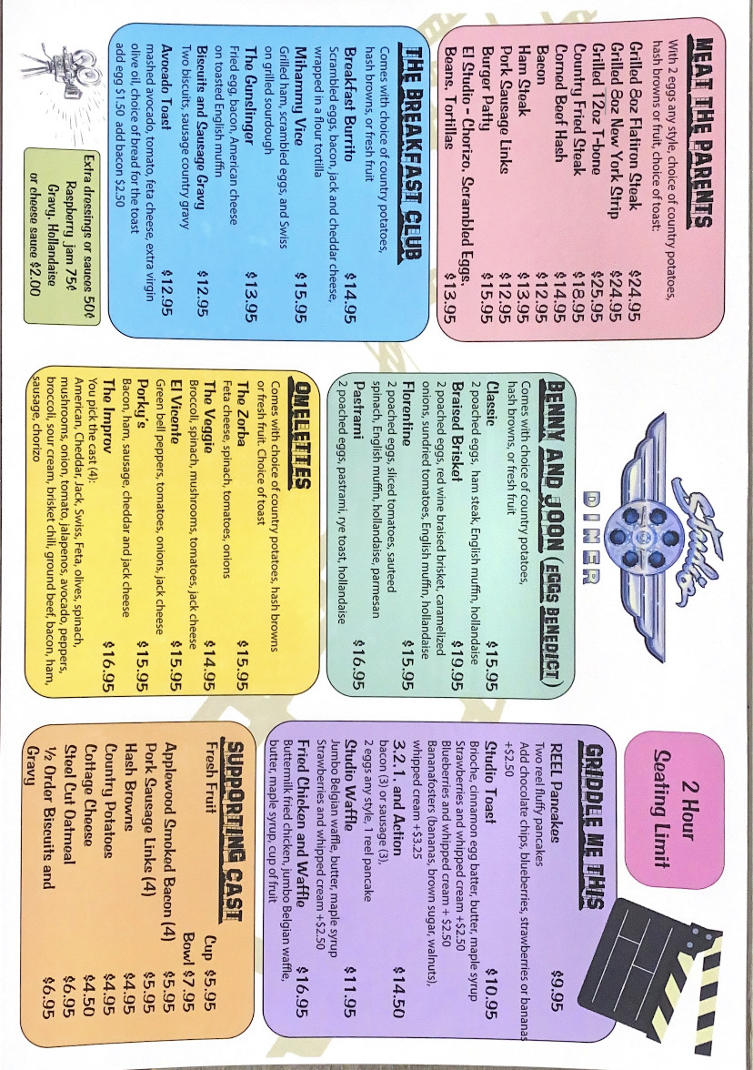 The menu at Studio Diner is an enticing journey through comfort food, with generous portions that invite you to savor every bite. Prepare your taste buds for a treat with highlights like the MEAT THE PARENTS offerings, featuring a succulent 8oz Grilled Flatiron Steak served with two eggs any style, accompanied by your choice of country potatoes, hash browns, or fresh fruit. Craving something hearty? The Grilled 12oz T-bone or the classic Country Fried Steak will not disappoint. Each dish is prepared with attention to detail, ensuring rich flavors that resonate deeply with diners.